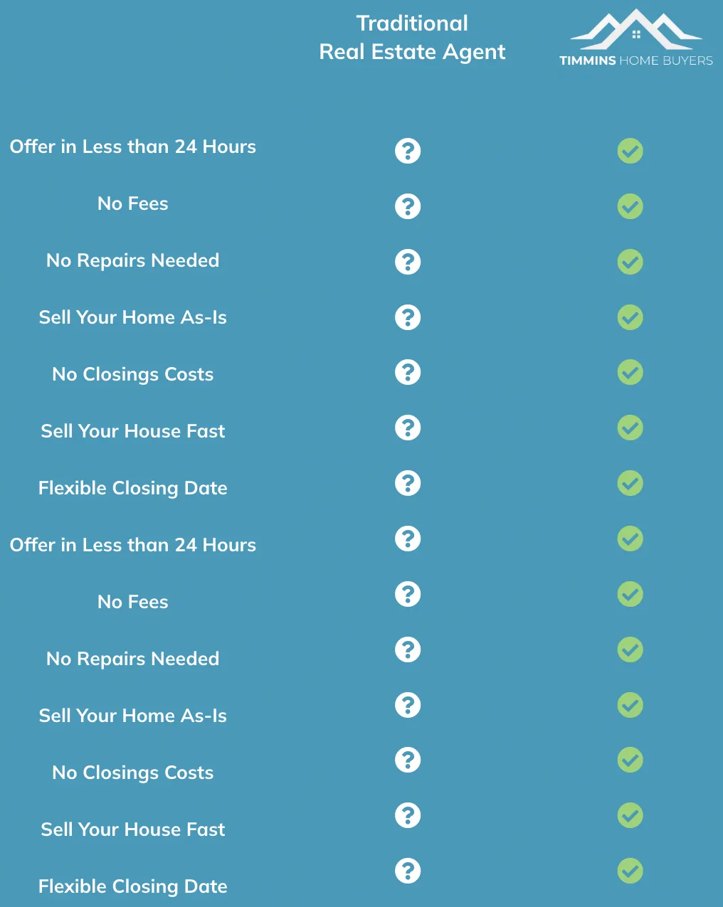 You will never pay any commissions or fees. Timmins Home Buyers goes above and beyond to help sellers cover legal fees, moving expenses, or first and last month's deposit at a new rental.
